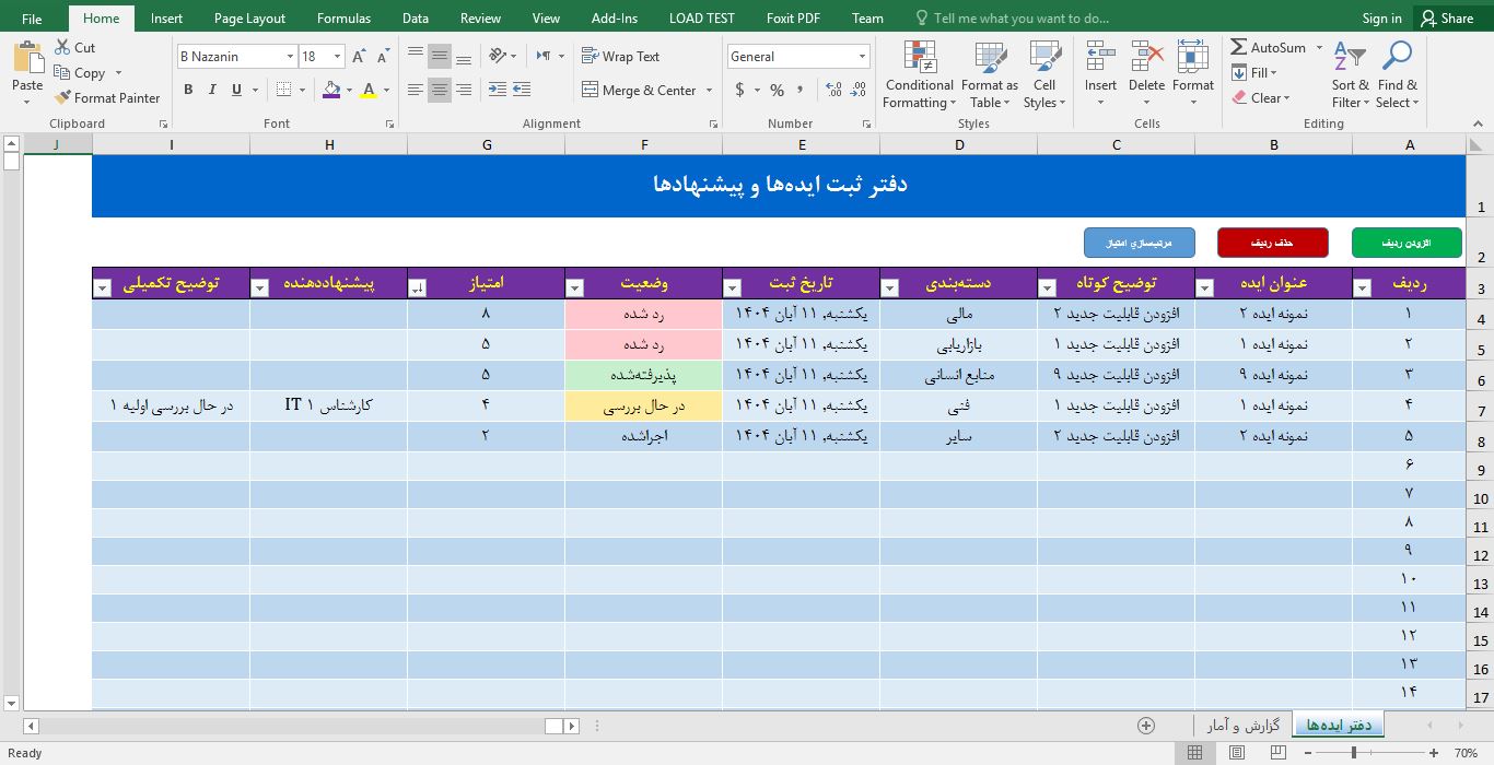 📘 فایل اکسل دفتر ایدهها و پیشنهادها (سیستم مدیریتی پیشرفته ثبت و تحلیل ایدهها)