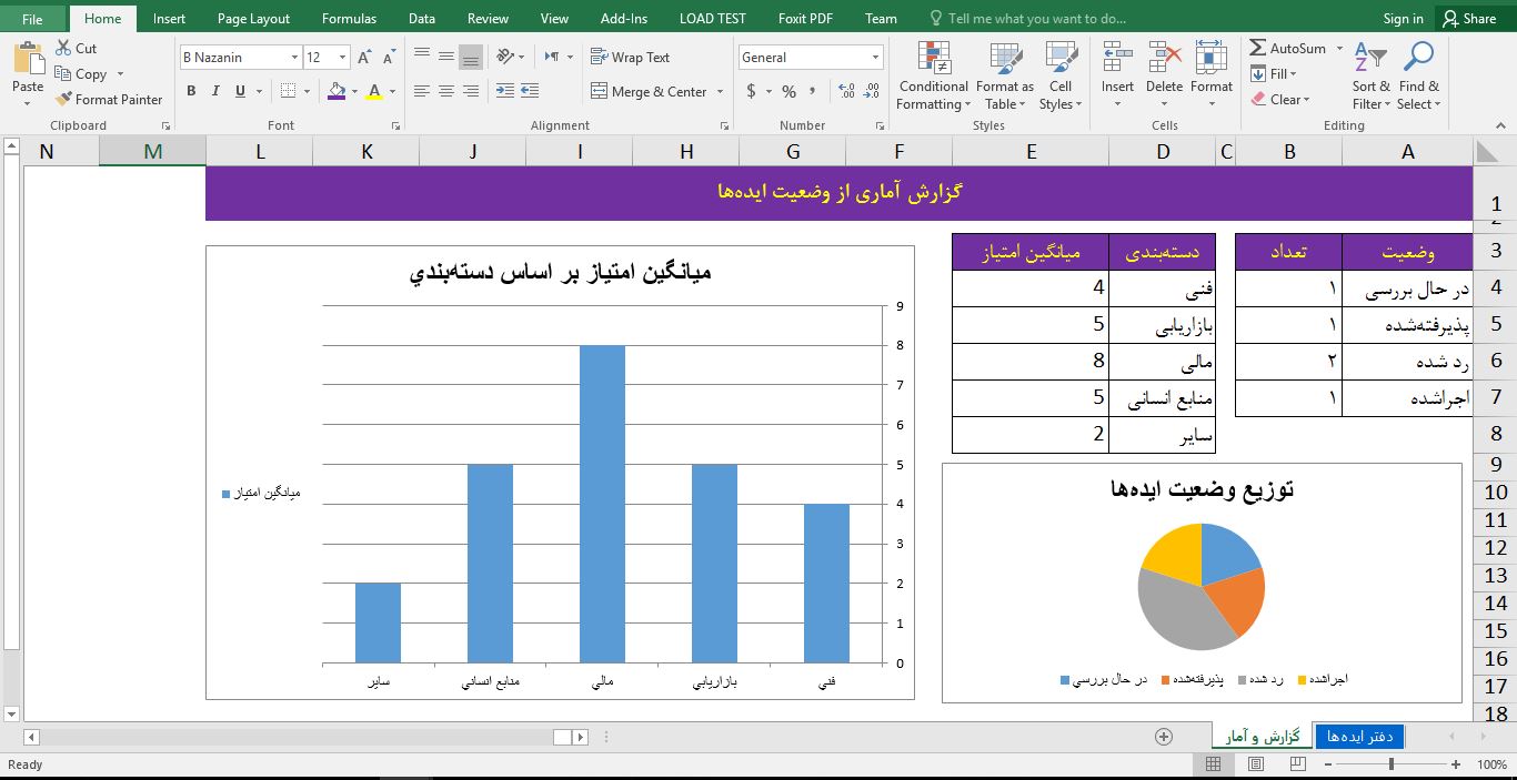 یکی از نقاط قوت این فایل، وجود نمودارهای تحلیلی و شاخصهای آماری است که به مدیران کمک میکند تصویری دقیق از وضعیت ایدهها و روند بررسی آنها داشته باشند. شما میتوانید با یک نگاه، وضعیت کلی ایدههای در حال بررسی، پذیرفتهشده، ردشده و اجراشده را مشاهده کنید و میانگین امتیازدهی به هر دسته از ایدهها را بسنجید. به این ترتیب، تصمیمگیریهای مدیریتی سریعتر، دقیقتر و مبتنی بر داده انجام میشود. علاوه بر این، رنگبندی هوشمند وضعیتها و فرمولهای خودکار ثبت تاریخ و امتیازدهی، باعث میشود هیچ موردی از قلم نیفتد و تمام اطلاعات بهصورت زنده بهروزرسانی شوند.